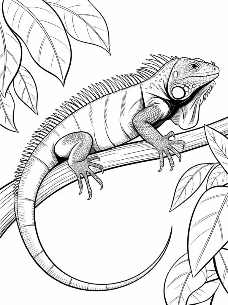 Older kids will love this realistic iguana coloring page showing a detailed lizard resting on a branch. Perfect for practicing shading, textures, and natural tones.