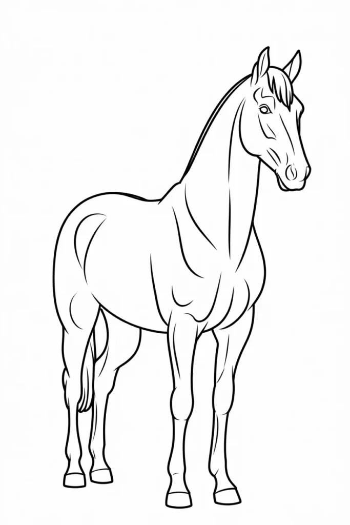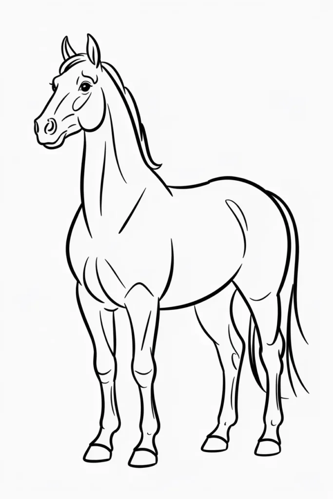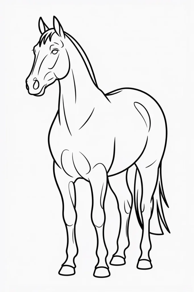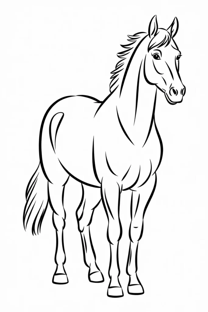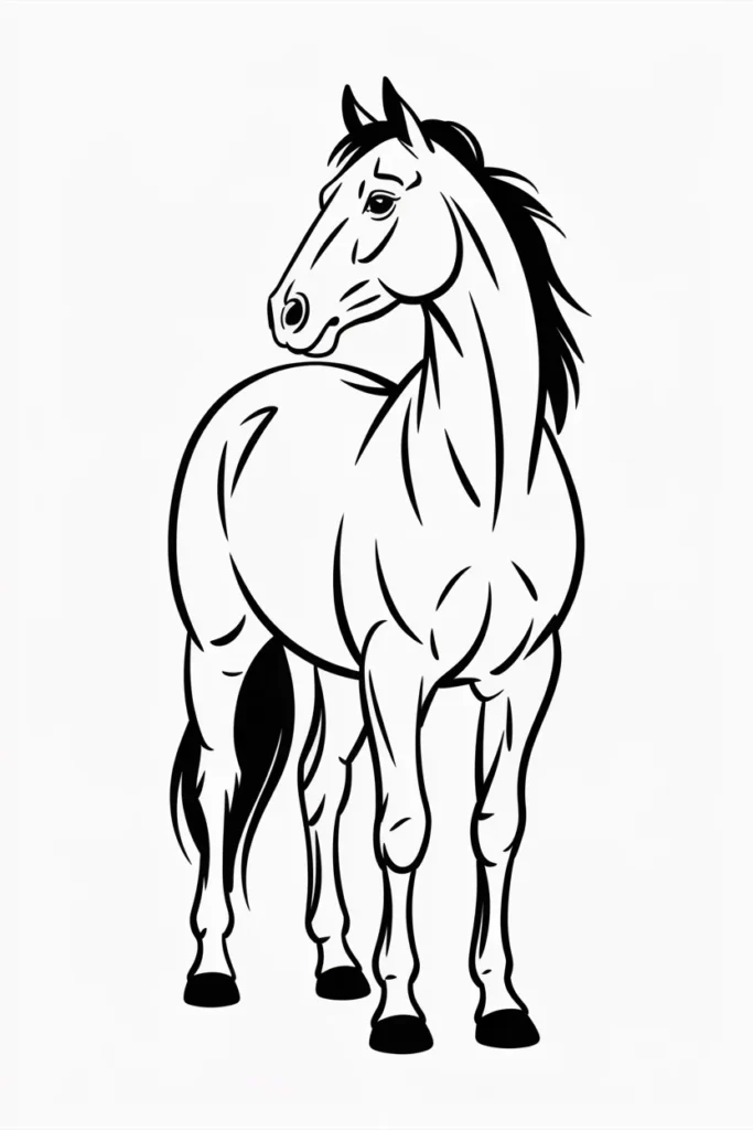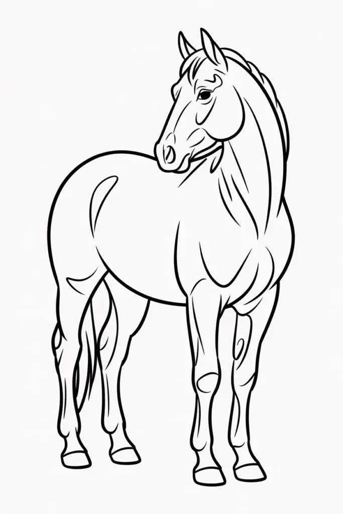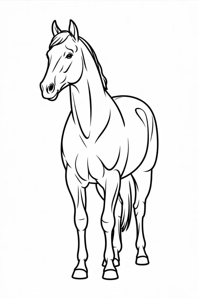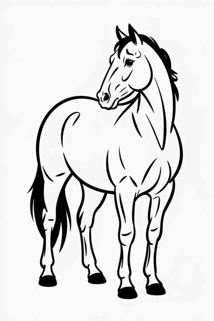 This horse coloring page shows a proud horse standing tall and calm. The clean lines make it perfect for beginners.